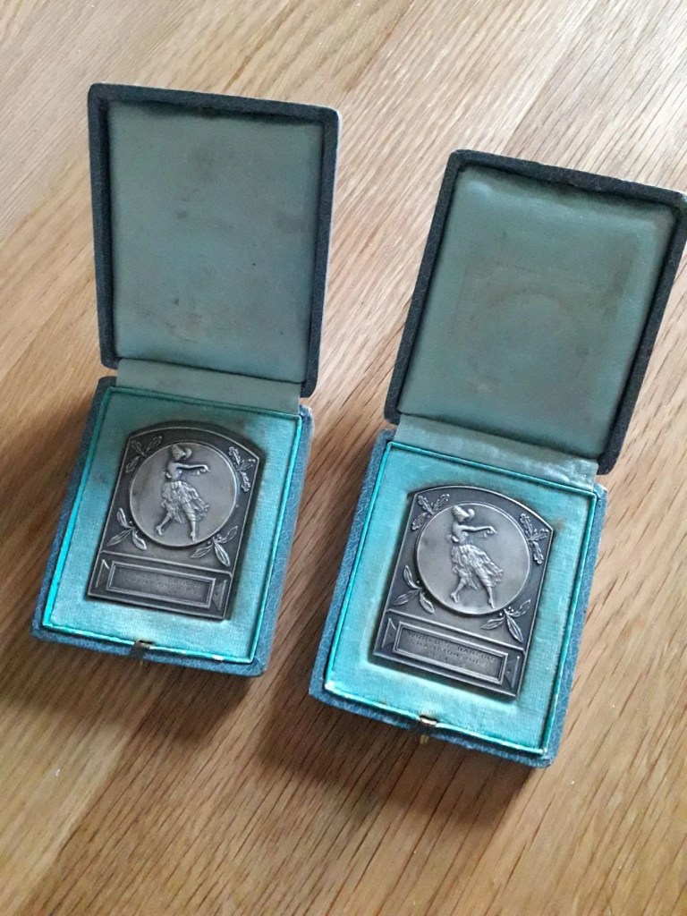 I’ve been doing some sleuthing, and I believe that these medals were awarded in 1922 to the winners of the Amateur Waltz at the North Western Area regional final of the World Dancing Championships, which was held in the famous Blackpool Tower Ballroom.